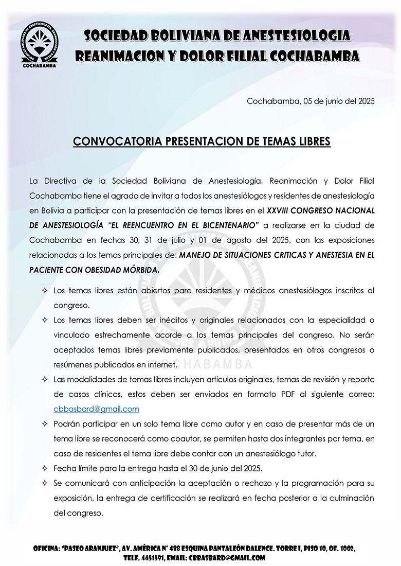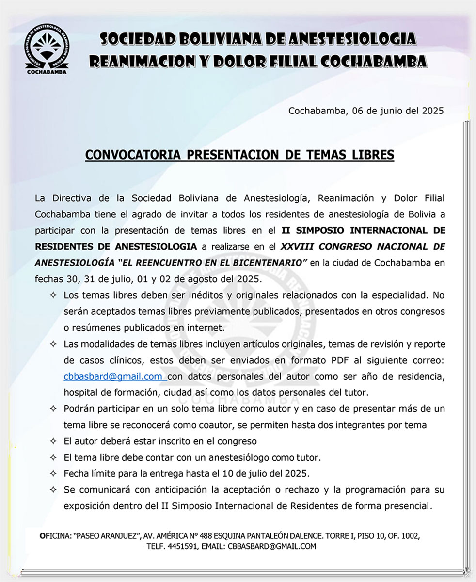 II Simposio Internacional de Residentes de Anestesiología; XXVIII Congreso Nacional de Anestesiología «EL REECUENTRO EN EL VICENTENARIO». En la ciudad de Cochabamba lo dias 30,31 de Julio, 01,02, de Agosto 2025. Descargar.